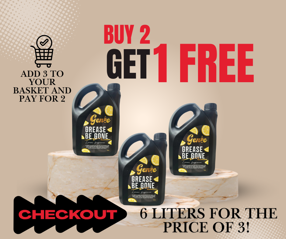 Remove grease and grime with our top-selling 2 Ltr Grease Be Gone degreaser. Its powerful formula, scented with a refreshing lemon fragrance, effectively tackles tough stains on fabrics and clothing. Say goodbye to stubborn grease and hello to a clean, fresh-smelling space.